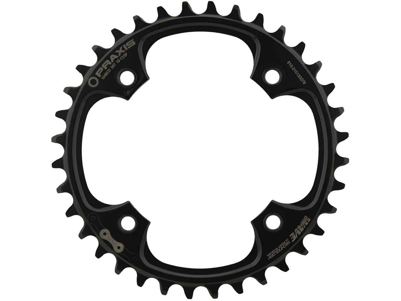 Le plateau 1 vitesse eRing Steel MTB de Praxis Works est fabriqué en acier inoxydable forgé à froid et bruni, ce qui le rend particulièrement adapté aux sollicitations accrues des vélos à assistance électrique. Il est doté d’un cercle de trous de 104 mm et de quatre trous filetés pour les vis de plateau M8. En outre, le plateau est caractérisé par son profil Wave Tech. Les dents sont disposées alternativement plus à gauche et plus à droite, ce qui améliore la rétention de la chaîne.